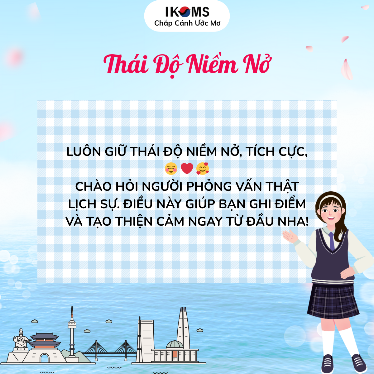 Giữ nụ cười nhẹ, chào hỏi lịch sự và thể hiện sự tự tin, tích cực trong suốt buổi phỏng vấn. Thái độ tốt luôn là điểm cộng lớn giúp bạn ghi dấu ấn với người đối diện.