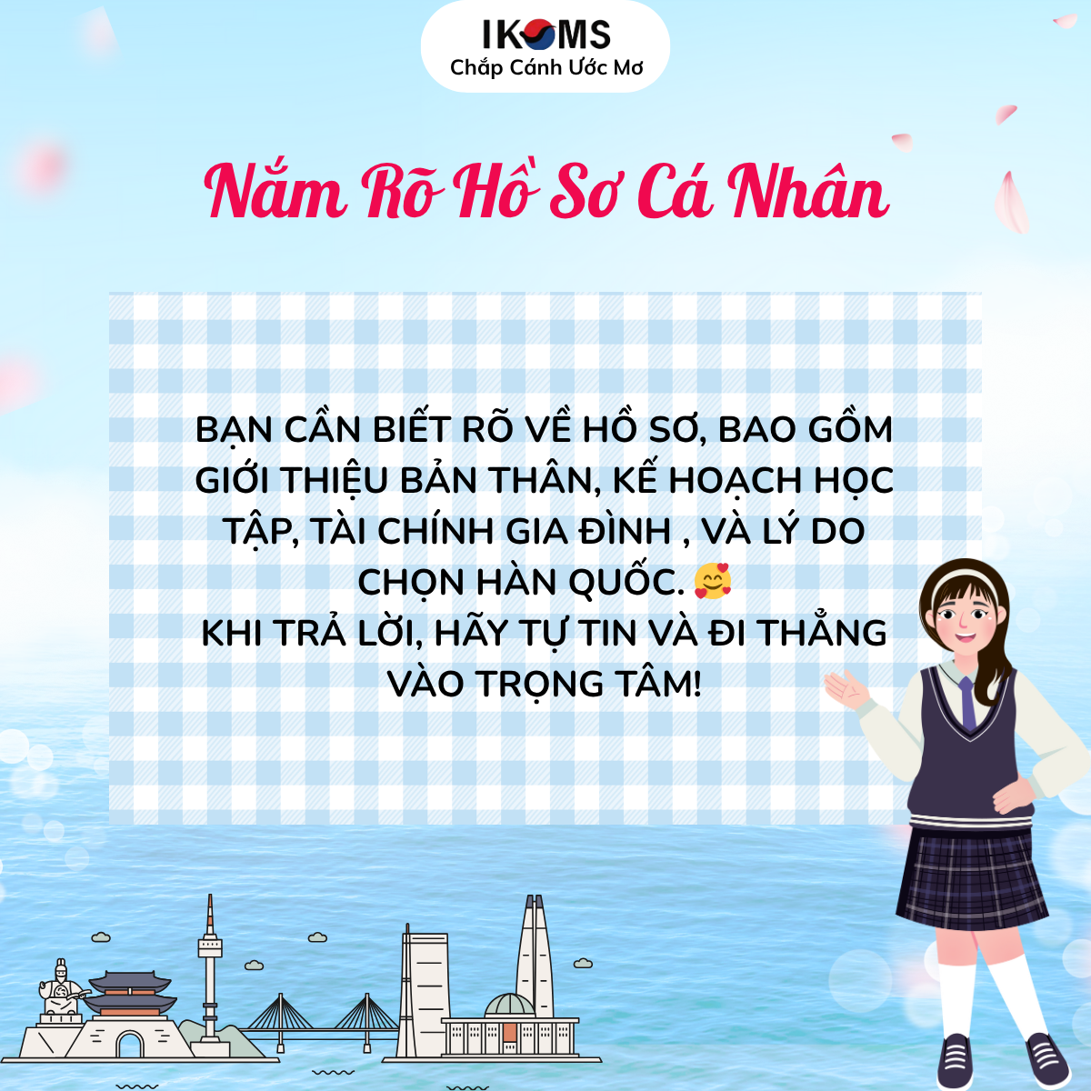 Thuộc lòng thông tin cá nhân, kế hoạch học tập, tài chính và lý do chọn Hàn Quốc. Khi trả lời, hãy ngắn gọn, mạch lạc và thể hiện quyết tâm học tập nghiêm túc của bạn.