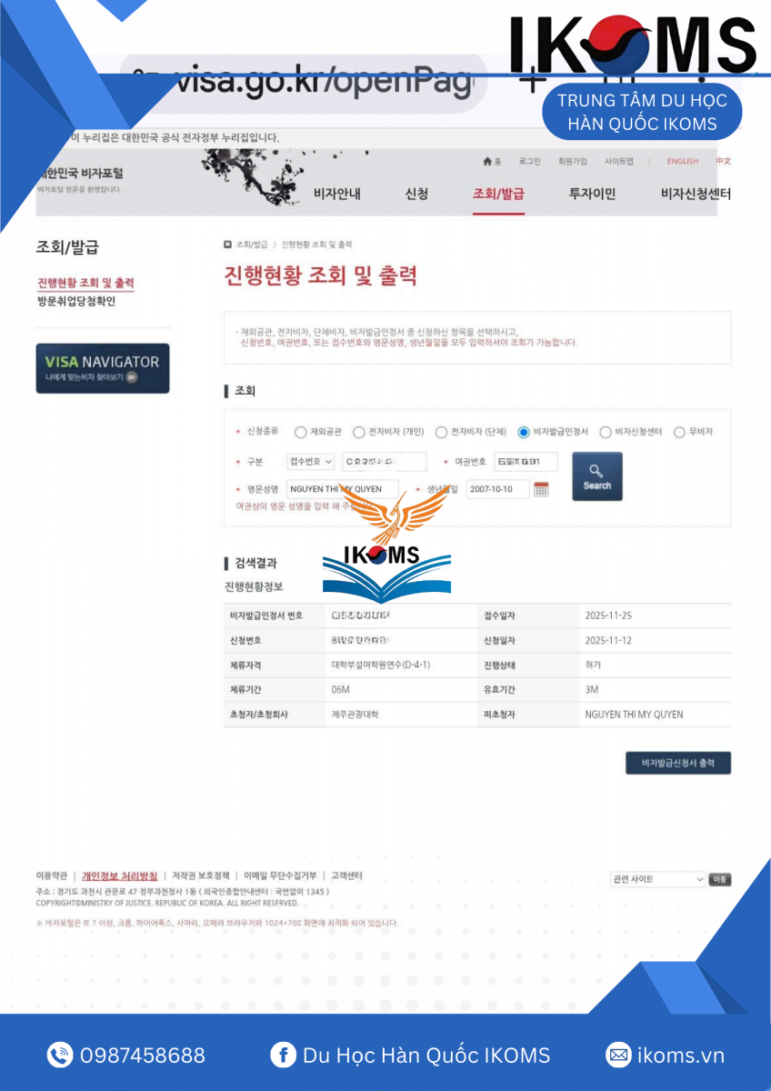 IKOMS trân trọng chúc mừng bạn Quyên đã chính thức đạt code visa Top 3 và trở thành tân sinh viên của Cao đẳng Du lịch Jeju – Hàn Quốc. Đây là một cột mốc vô cùng ý nghĩa, đánh dấu bước ngoặt quan trọng trong hành trình chinh phục giấc mơ du học Hàn Quốc của bạn.