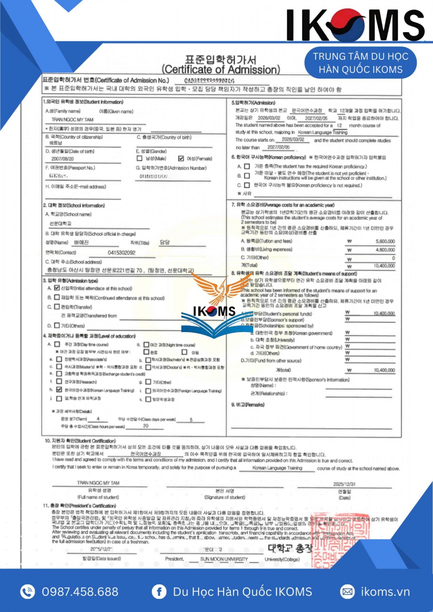 Chính thức trở thành tân sinh viên tương lai của Đại học Sunmoon (Sunmoon University) – ngôi trường nổi tiếng với hệ thống đào tạo quốc tế và chính sách hỗ trợ sinh viên nước ngoài.