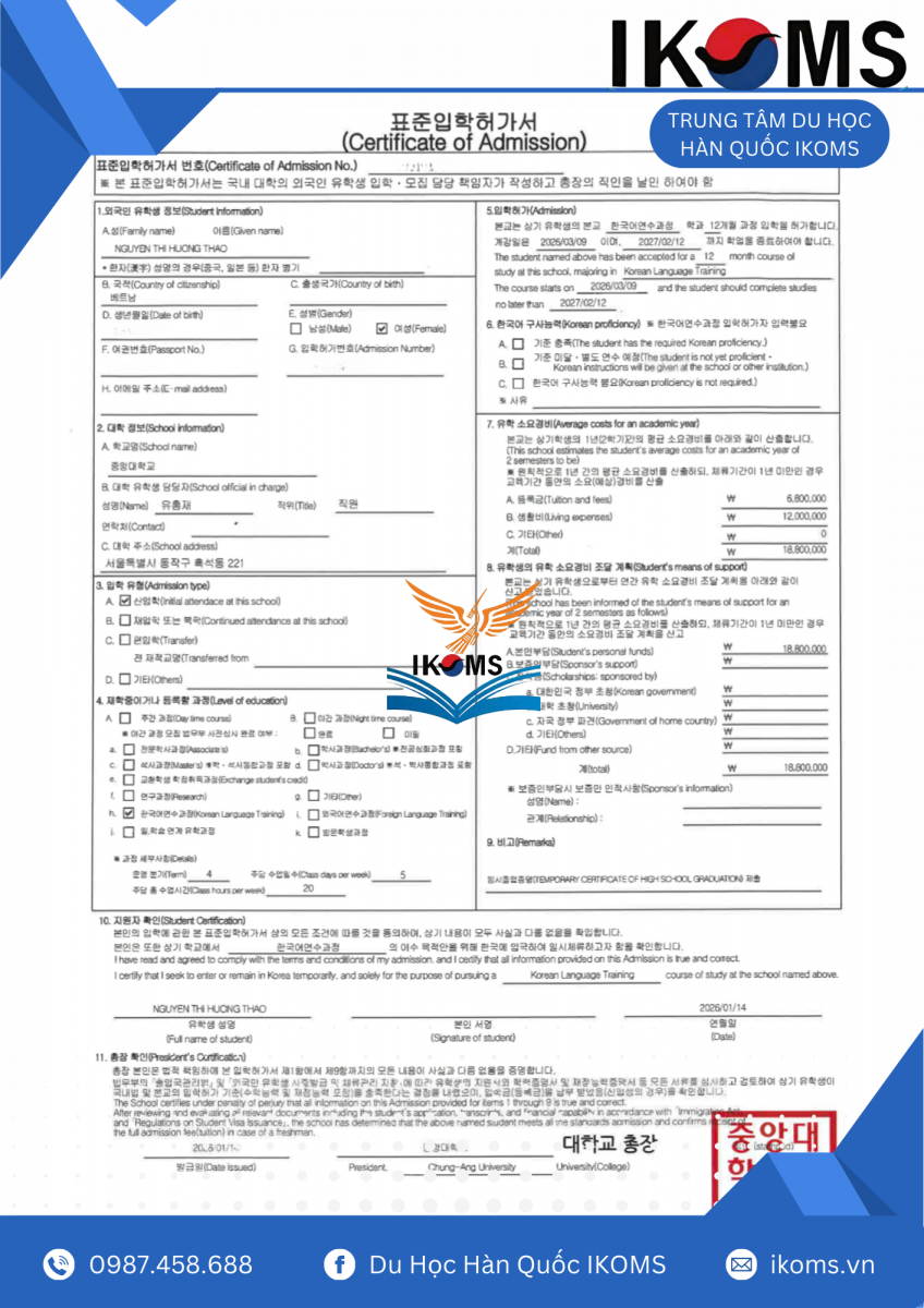 Chính thức nhận thư mời nhập học từ Đại học Chung-Ang (ChungAng University) – một trong những trường đại học hàng đầu Hàn Quốc, nổi bật về đào tạo các ngành truyền thông, kinh doanh và nghệ thuật.