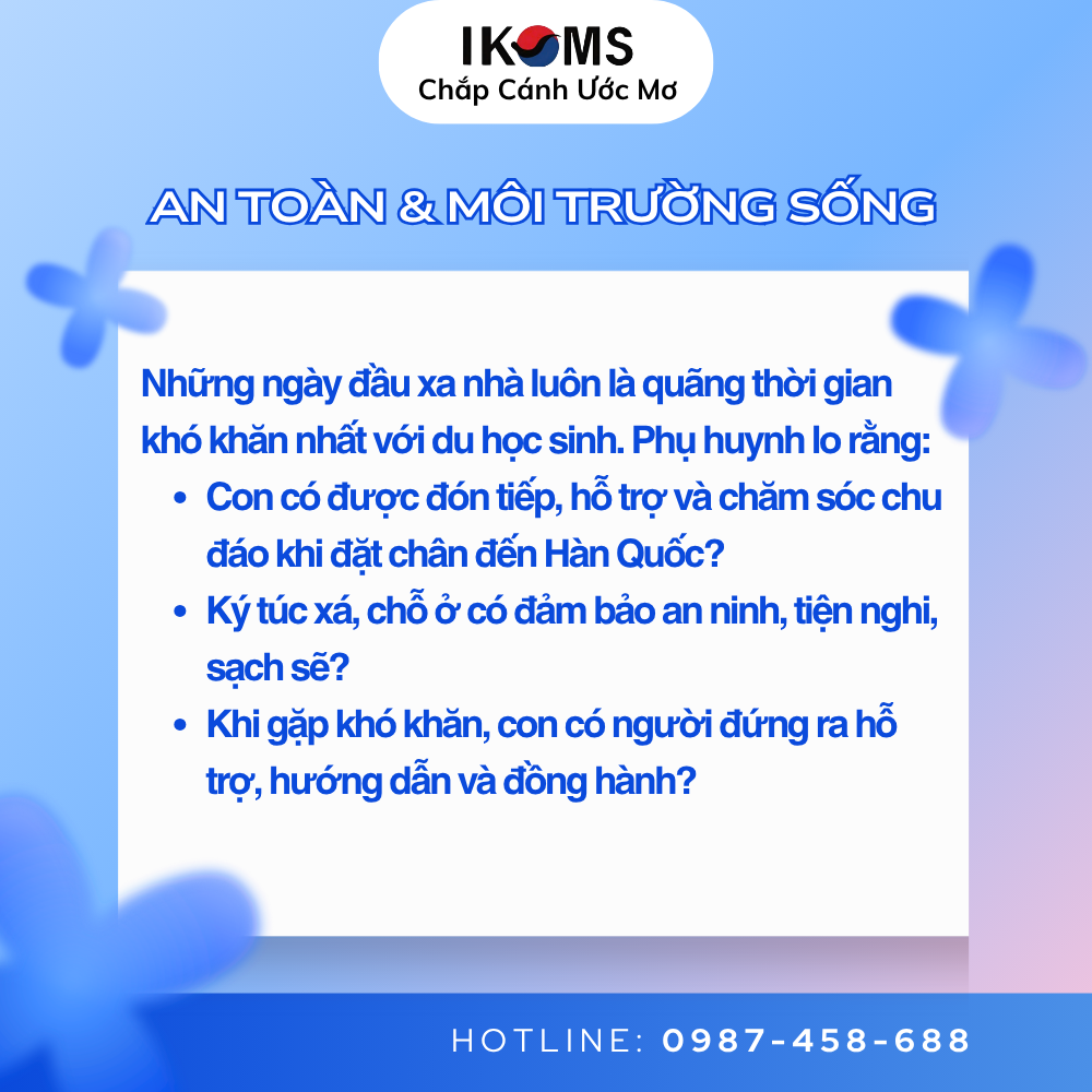 Tại IKOMS, mọi học sinh đều được hỗ trợ sắp xếp ký túc xá hoặc chỗ ở an toàn, có người phụ trách quản lý sinh viên quốc tế 24/7, và được hướng dẫn cụ thể về sinh hoạt, di chuyển, ứng xử tại Hàn Quốc.