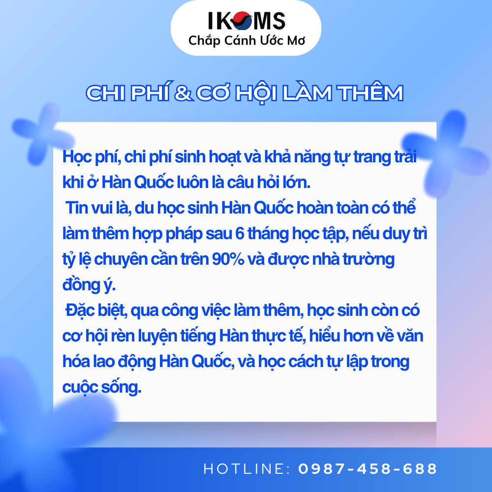 Tuy nhiên, tại Hàn Quốc, sinh viên quốc tế được phép làm thêm hợp pháp sau 6 tháng học tập, nếu duy trì tỷ lệ chuyên cần trên 90% và được trường cho phép.
