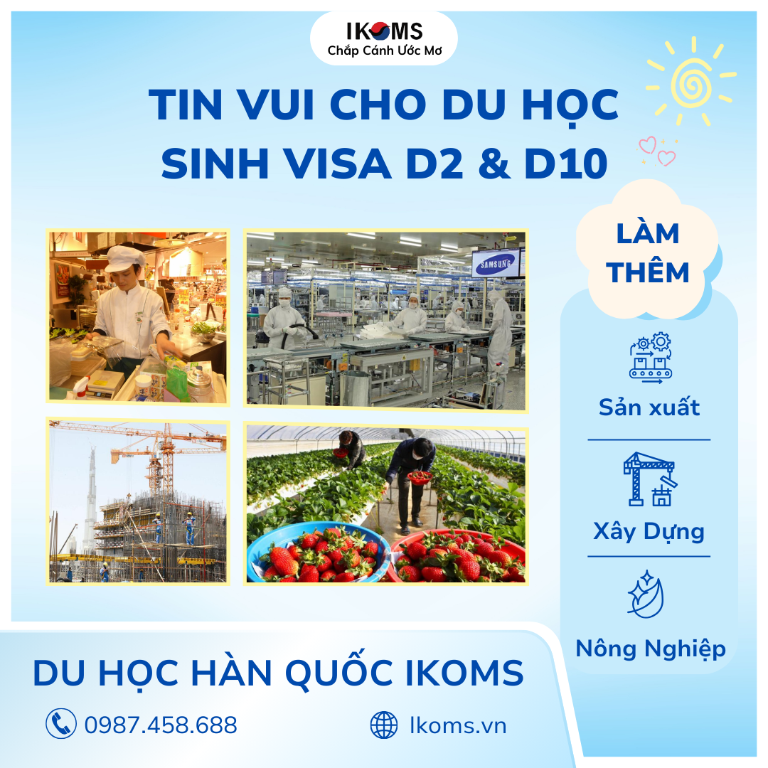 Trong thời gian tới, du học sinh quốc tế tại Hàn Quốc, đặc biệt là các bạn đang sở hữu visa D2 và D10, sẽ có thêm nhiều cơ hội làm thêm trong một số lĩnh vực mới. Đây được xem là một tín hiệu tích cực, giúp sinh viên vừa có thể trang trải chi phí sinh hoạt, vừa tích lũy thêm kinh nghiệm thực tế trong quá trình học tập.